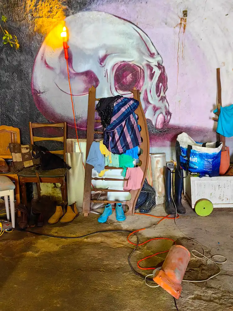 Neviem, či to myslí vážne. Ale rozhodnem sa nepýtať ďalej. Očami mi však naznačil že môžem vstúpiť. A tak vstupujem do niečoho, čo ťažko nazvať inak ako squat s nádychom revolučného umenia. Vo vzduchu cítiť kadečo, brčko, pach oleja a prístavu, možno i výkaly. Hlbšie do priestorov vstupujem len opatrne. syn ostal radšej vonku.