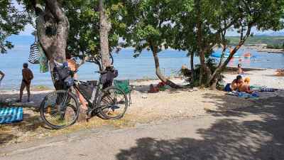 Pôvodne sme tak chceli do Ogulinu vyšliapať, ale splnenim cieľa a kúpaním v mori nejako vyprchalo nadšenie a predstava ďalšieho stúpania 1000 metrov v tom teple sa nám nepozdávala. Preto zvolíme deň voľna, obhliadku pláží na ostrove Krk, prenocovanie v Rijeke, doobeda oddych na miestnej pláži a poobede o tretej presun vlakom do Ogulinu.