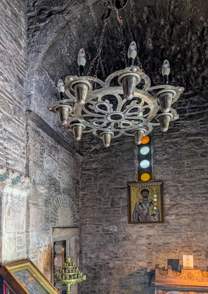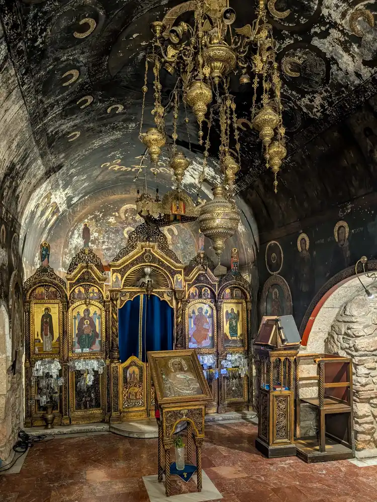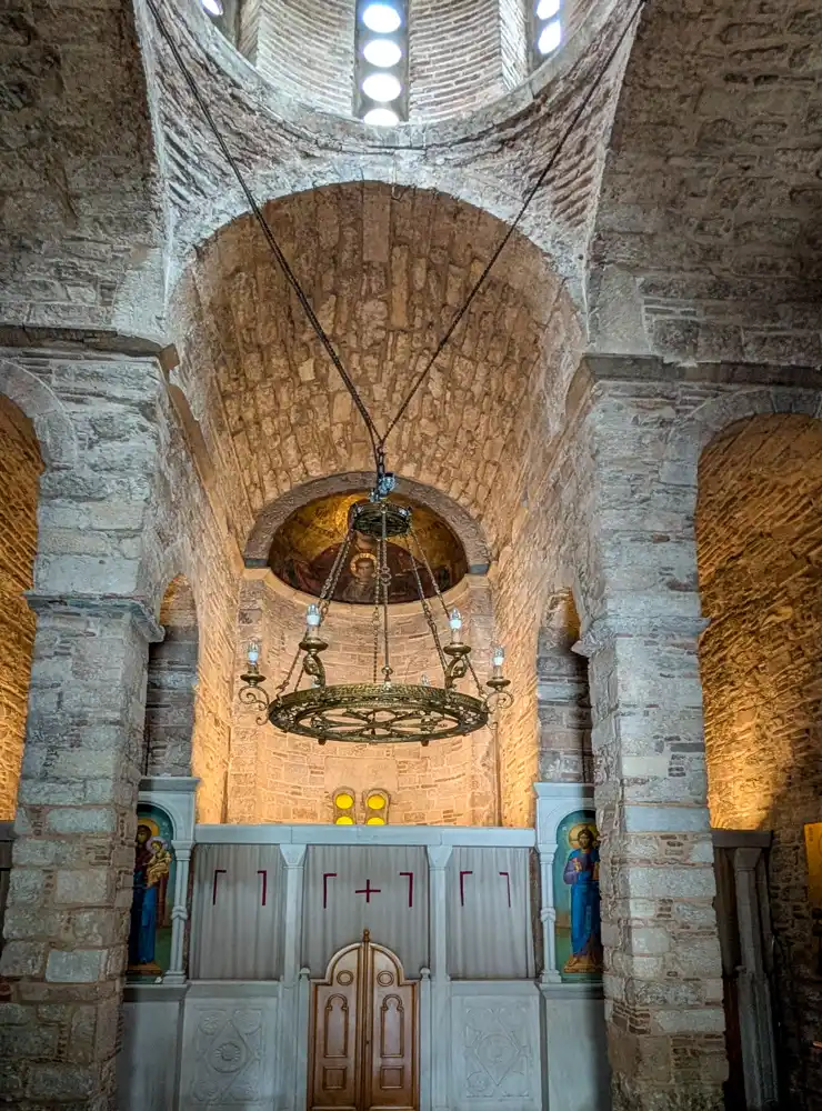 Agia Dynamis, to je čistá bizarnosť. Chrám je schovaný pod masívnou betónovou konštrukciou hotela, prekrytý poschodiami priamo medzi nosnými stĺpmi. Do tohto drobného sakrálneho priestoru sa sotva vojde viac ako desať ľudí.