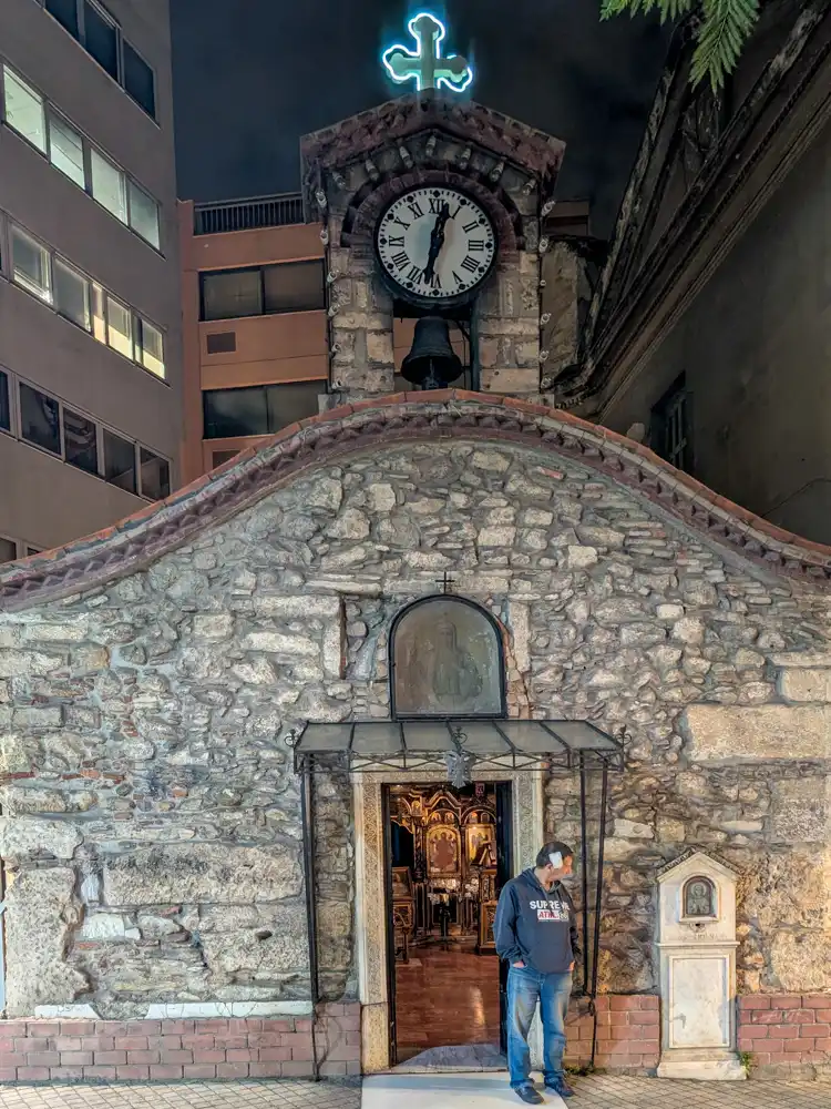 Ak sme rozprávanie o chrámoch začali bizarnosťou, musíme ňou aj skončiť. Ak nedávate pozor, maličký Agia Kyriake miniete. Je vtesnaný medzi obchody s náradím a remeselnícke dielne. Chrám totálne utopený v komercii. Vojdete dnu a vôňa kadidla sa bije s pachom motorového oleja a kovových pilín. Je to „robotnícky“ kostol. Miesto, kde sa viera nepredvádza, ale žije medzi nákupom skrutiek a rannou kávou.