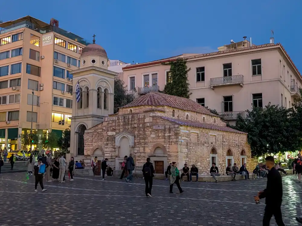 Presúvam sa na námestie Monastiraki. Je to križovatka antiky, shoppingu, dopravy i viery. Tú tu zastupuje ďalší byzantský klenot – chrám Pantanassa z 10. storočia. Kedysi to bol hlavný chrám kláštora, ktorý dal meno celej oblasti. Dnes je obklopený unavenými turistami, ktorí na jeho schodoch prežúvajú všadeprítomný stánkový gyros.