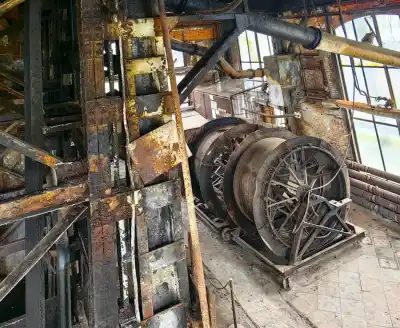 Dva zrkadlové obrie stroje s malou zelenou búdkou. V nej sedel možno najlepšie platený človek na bani. Práve on totiž rozvážal vozíky a ľudí po jednotlivých poschodiach bane.