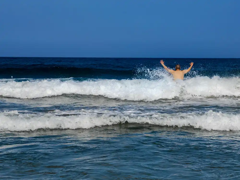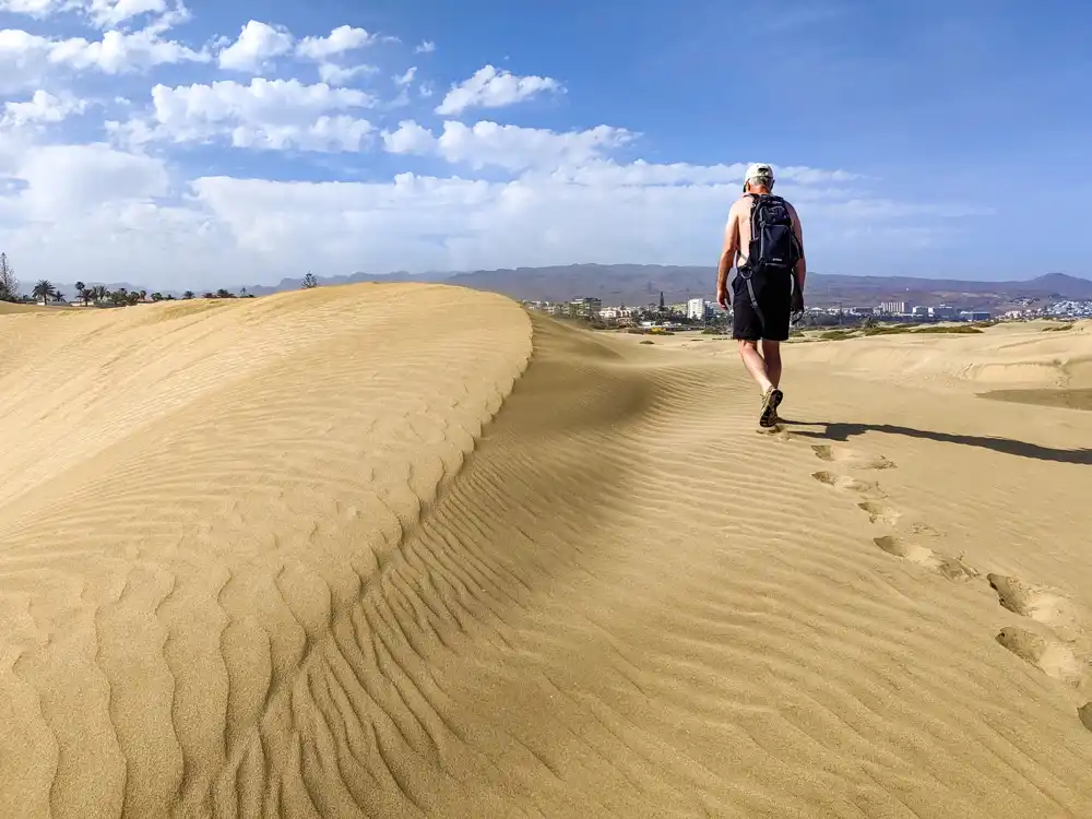 Domáci nám povedali, že toto je jedno z mála miest, kde Covid pomohol. Dva roky bez turistického ruchu významne pomohli dunám zregenerovať sa. My sme ocenili ešte jednu vec. Pláže okolo Maspalomas sú tak rozsiahle, že riešiť plavky a prezliekanie je tu bezpredmetné. Nudizmus tu proste frčí a my to radi. Surferi sa zhromažďujú na zákrute spájajúcej Maspalomas s Playa del Inglés.