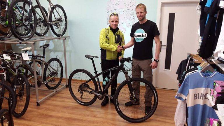 Poznáte tohto fešáka? Ivan Labic – jeden z víťazov prvého ročníka cyklistickej časti výzvy 7 kopcov, 3 jazerá, ako si preberá svoju cenu, bicykel Bianchi Kuma. Ešte doštelovať, naladiť, a možme frčať. Tento rok na víťaza čaká podobné delo.