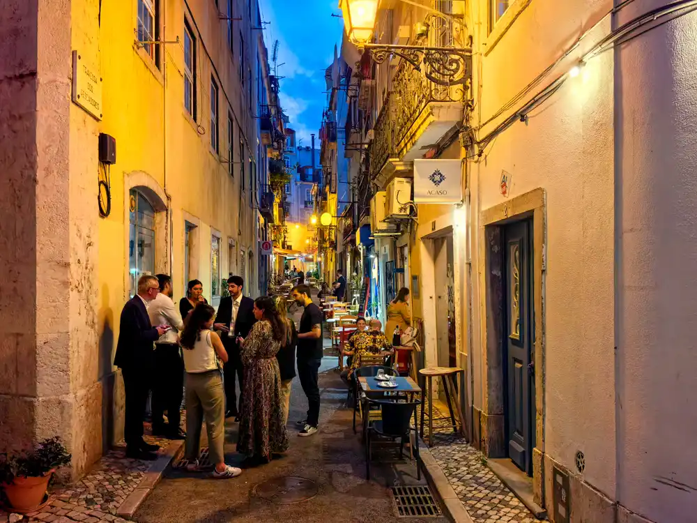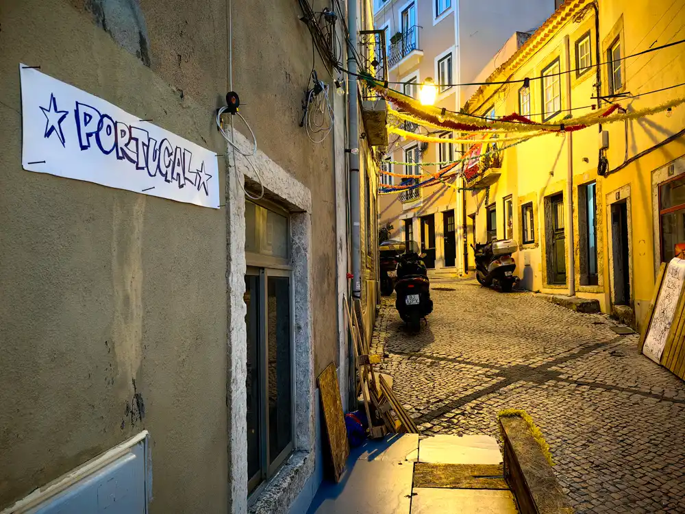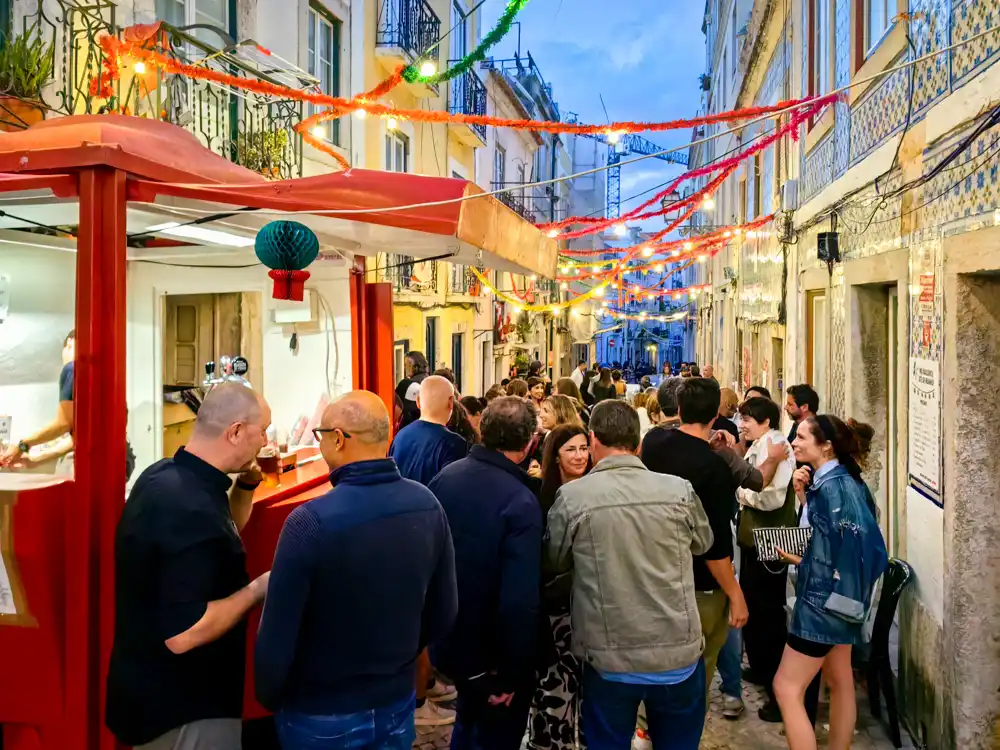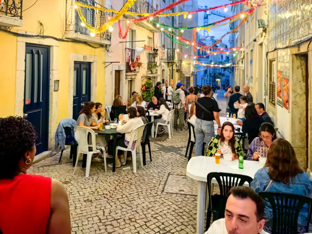 Neskôr sme pochopili prečo. 24. júna slaví Lisabon Dia de São João – jeden z troch júnových Santos Populares, keď mesto hodí za hlavu všetky plány a vyjde do ulíc. Alfama a Mouraria majú svoje arraially so sardinami a folklórom. Chiado má svoju vlastnú verziu – kozmopolitnejšiu, hlučnejšiu, bez nostalgie ale s rovnakou základnou myšlienkou: že ulica patrí ľuďom.