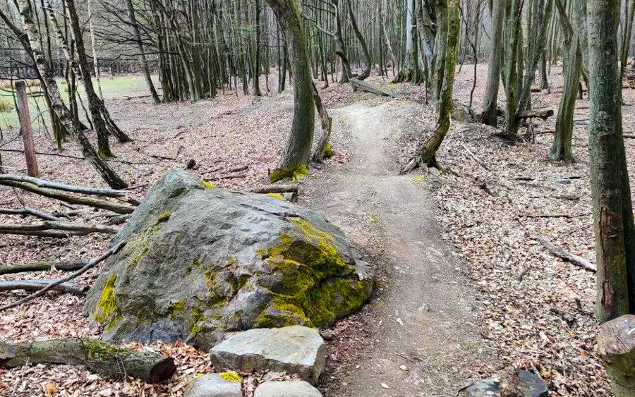 Ďalej sa po tomto bláznení vo výmole trail spája s pôvodnou vetvou a pokračuje miernym kopcom až rovinkou. Po ceste sa nachádza ešte zopár prekážok v podobe kameňov, vlniek, úzkych prejazdov medzi stromami. Na záver trailu ešte jeden prejazd cez výmoľ a sme dole nad priehradou v Lozorne.