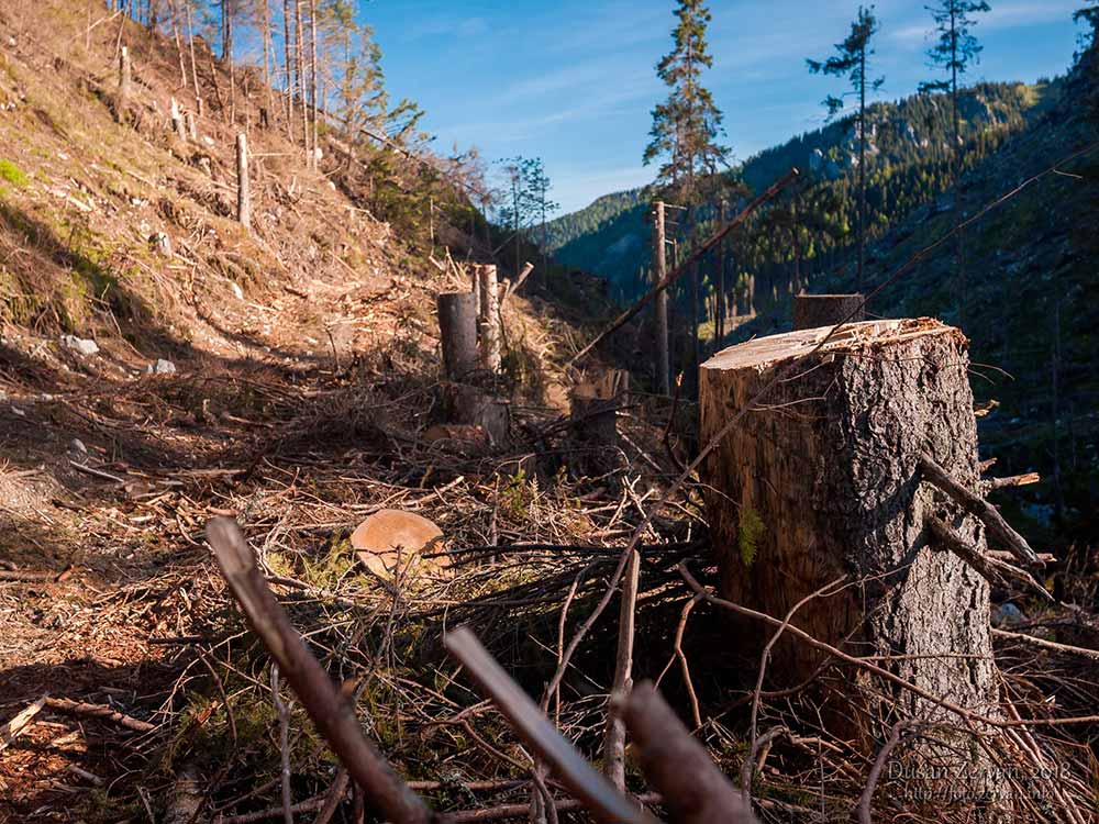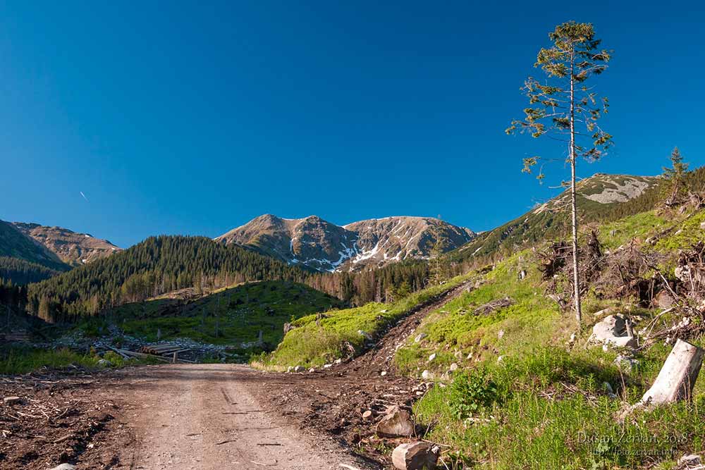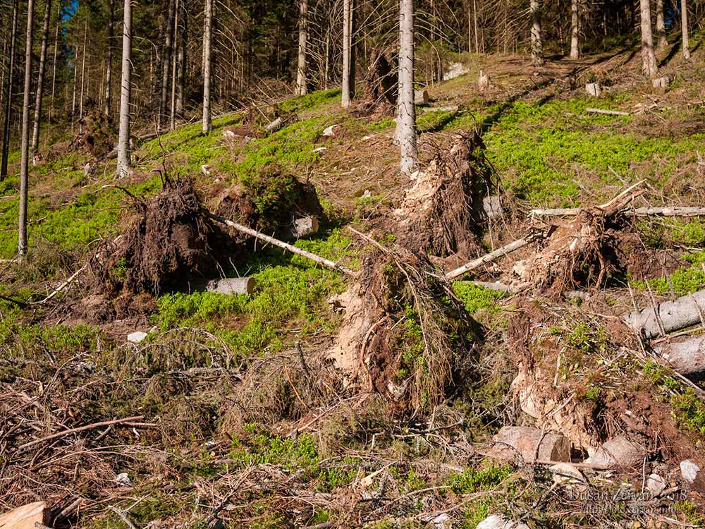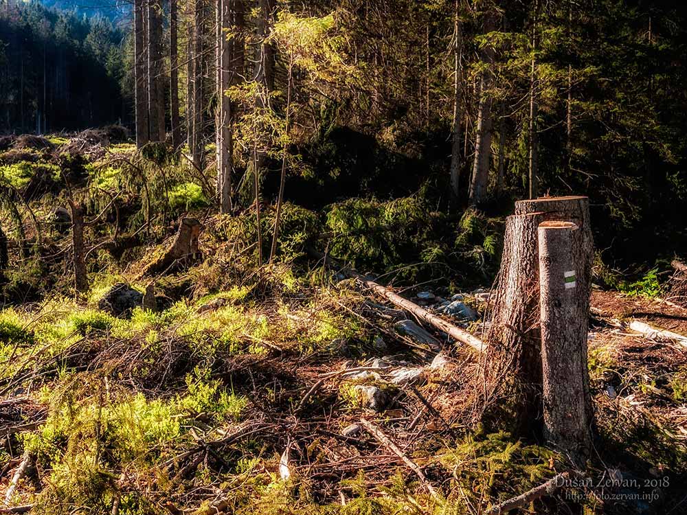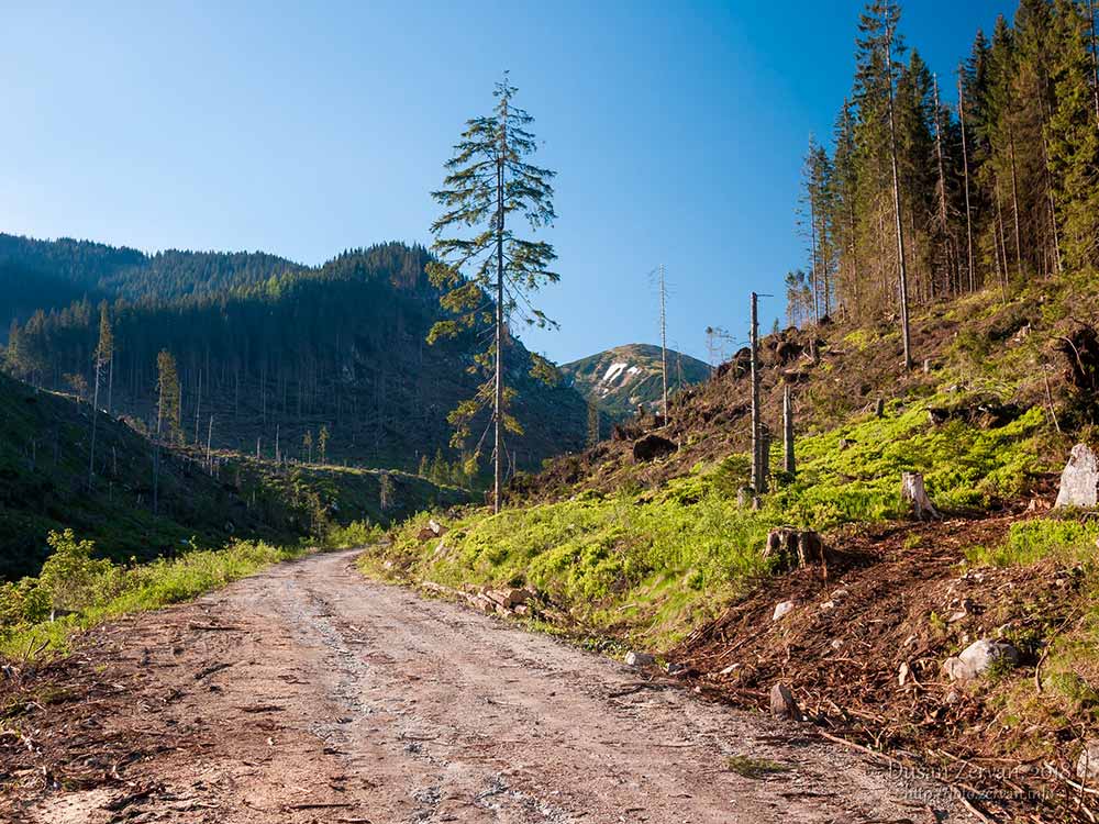 či skôr širokou lesnou cestou v nej. Prv bola lemovaná ihličnatými lesmi, no stromy víchor polámal ako zápalky – spočiatku vidno len pne a po okrajoch cesty kopy dreva nachystaného na odvoz, neskôr i popadané stromy. Niektoré polámané, niektoré vyvrátené, je to smutný pohľad. Zamýšľam sa, či prv nebýval taký silný vietor ako v posledných rokoch a prečo teraz je. A tiež, či má človek v národnom parku zasahovať alebo nie. Príroda si iste poradí aj sama, ale môže jej to trvať stovky rokov, času má dosť. Míňam odbočku k partizánskym bunkrom – aj by som sa šiel pozrieť, no nechcem sa zdržiavať a ponurých podnetov bolo už dosť, prišiel som sem do prírody.