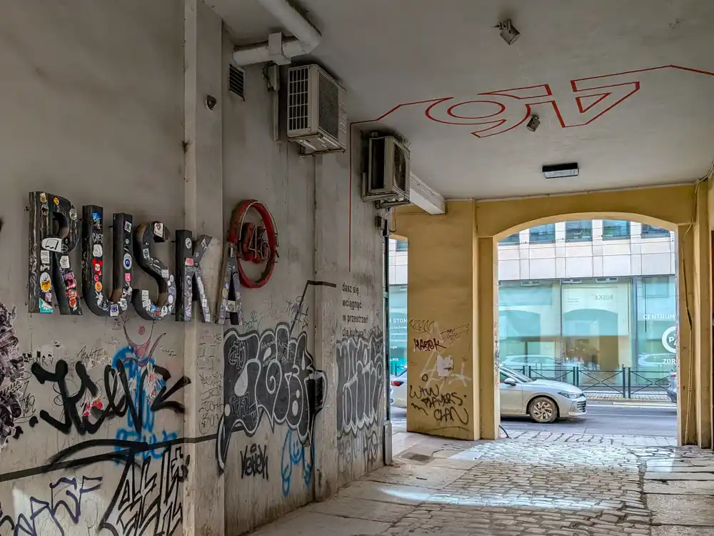 Ak hľadáte Neon Gallery Wrocław, Google vás pošle na Ruska 46. Ak hľadáte zážitok, ktorý nie je vyžehlený pre turistické brožúry, musíte prísť po ôsmej večer. Cez deň je to priechod. Betón, grafity, umelecké dielne a zatvorené dvere. Večer sa z toho stane malý nezávislý vesmír.