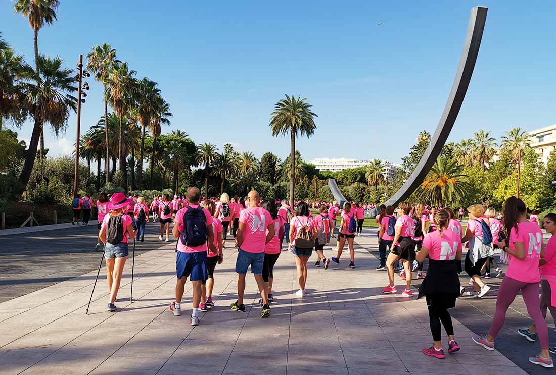 Ešte som ani nezostúpil z bicykla v centre mesta a už sa oproti mne hrnie horda ľudí v ružových tričkách. Nejaký dúhový pochod?  Nie. práve naopak. Pochod za zdravie Nice proti rakovine prsníka.