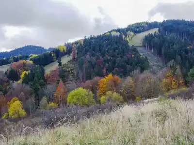 Vyšli sme ponad chaty na lúku, cez ktorú sme sa stále po žltej dostali opäť do lesa. Tu nás čakalo stúpanie, našťastie iba mierne. Cesta lesom bola príjemná, lístie pod nohami príjemne šušťalo a nám sa podarilo nájsť aj niekoľko hríbov. Miestami cestu križoval padnutý strom, takže sme museli trochu schádzať z cesty, aby sme ho obišli. Občas bola cesta podmáčaná vodou z potoka, ale ani toto nespôsobilo žiadne komplikácie.