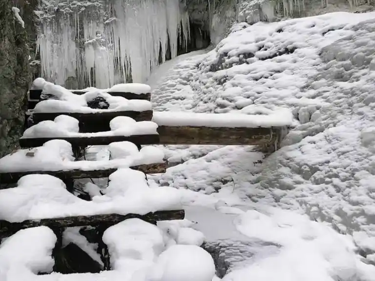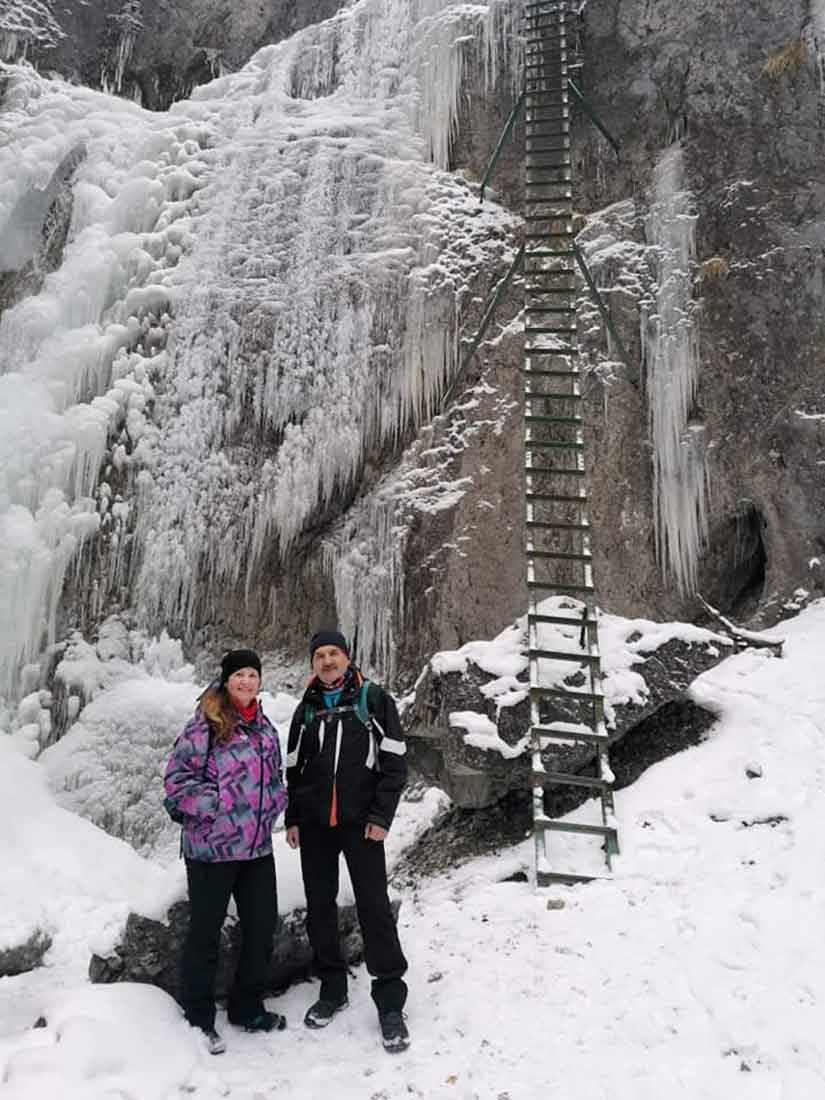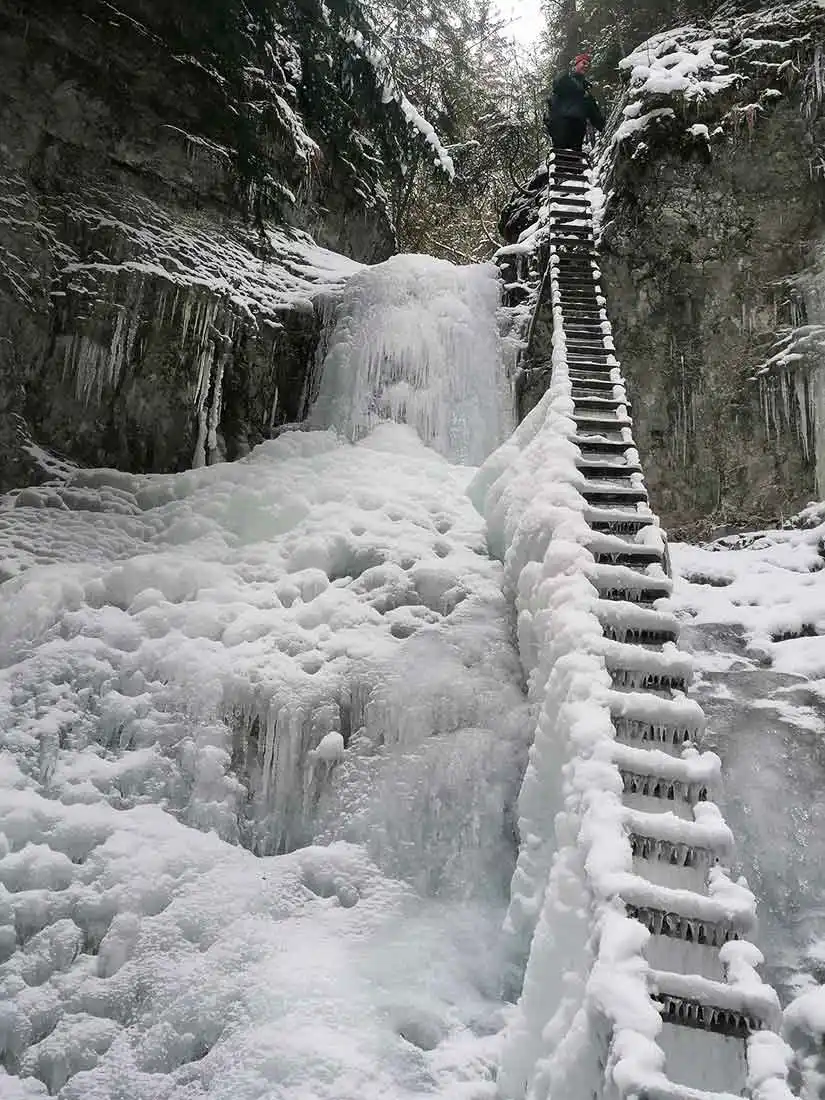 Pred nami sa objaví najdlhší železný rebrík v Slovenskom raji. Má okolo 18 m, pri ňom je nádherný Veľký Vodopád pokrytý sčasti ľadom.