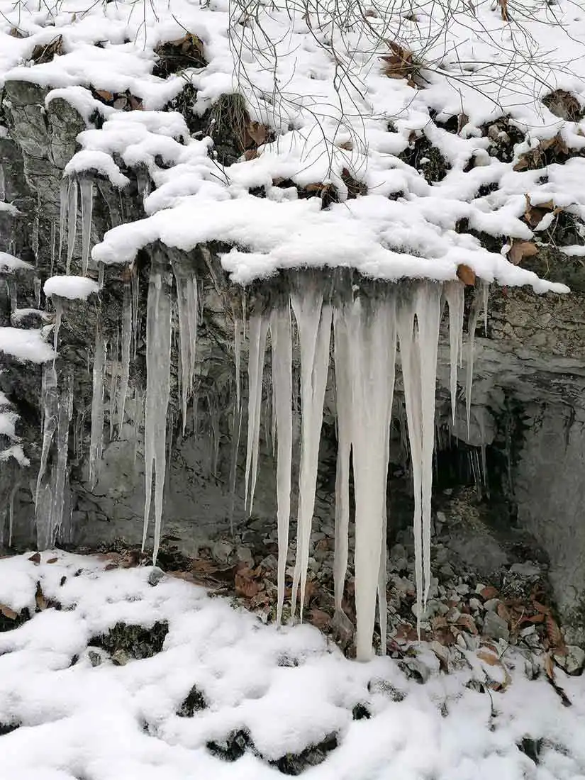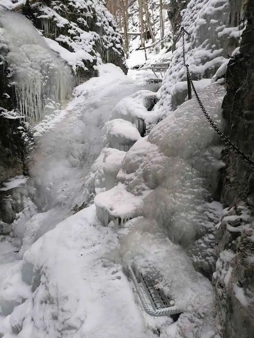 Pohyb je náročný, radšej si naťahujeme mačky a pokračujeme. Na bočných svahoch a stenách sa vytvárajú nádherné ľadové cencúle. Pomocou lán a reťazí prechádzame zasneženými drevenými rebríkmi a stúpačkami.