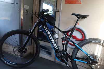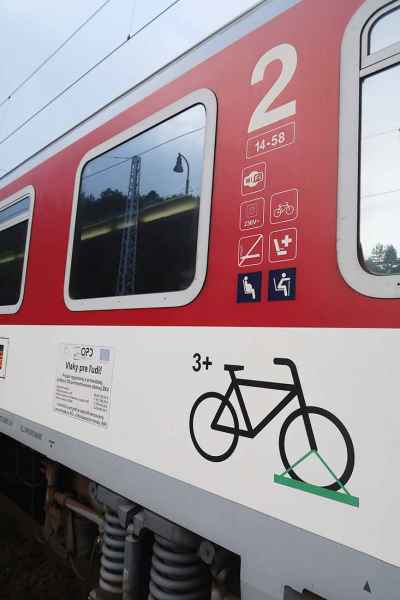 Hurá do vlaku. Ak nemá vlak vyhradené miesto pre bicykle, nastupujete vždy vpredu alebo vzadu. Zvyčajne zatarasíte východ, tak je lepšie byť blízko a v pozore na každej stanici. Až v Mikuláši prestupujem opäť do moderného rýchlika, kde môžem bicykel pokojne zavesiť. A pohneme sa znova. O krok v diaľ. 🙂