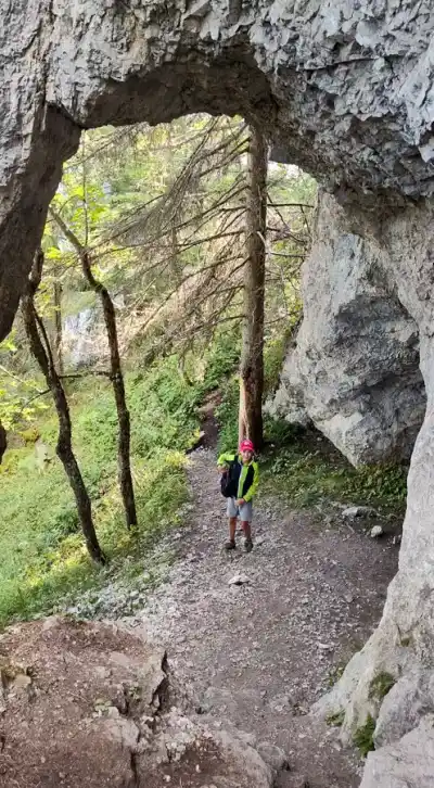 Skaly, popod ktoré sme kráčali, mali v sebe množstvo dier, väčších či menších jaskýň, skalné okná. Skrátka, príroda sa tu fakt vyhrala. Aj vďaka tomu si človek menej uvedomoval, aký je ten zostup náročný. Pomedzi skaly bol sem tam nejaký polom, ktorý prestriedal klasický lesný chodník.