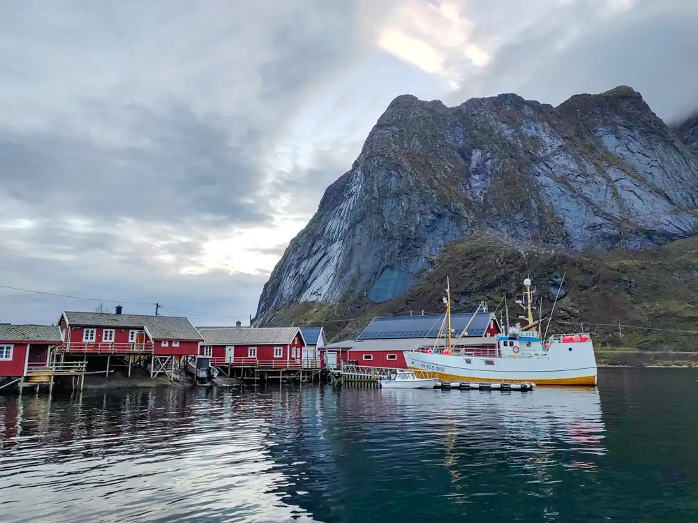 Po zostupe sa presúvame do Reine, rybárskej dedinky, ktorá sa často označuje za najkrajšiu v Nórsku. A áno, je fotogenická. Ale hlavne je skutočná. Žiadne kulisy. Rorbuer tu stoja na koloch priamo nad vodou a sušiaky na tresky sú bežnou súčasťou panorámy.