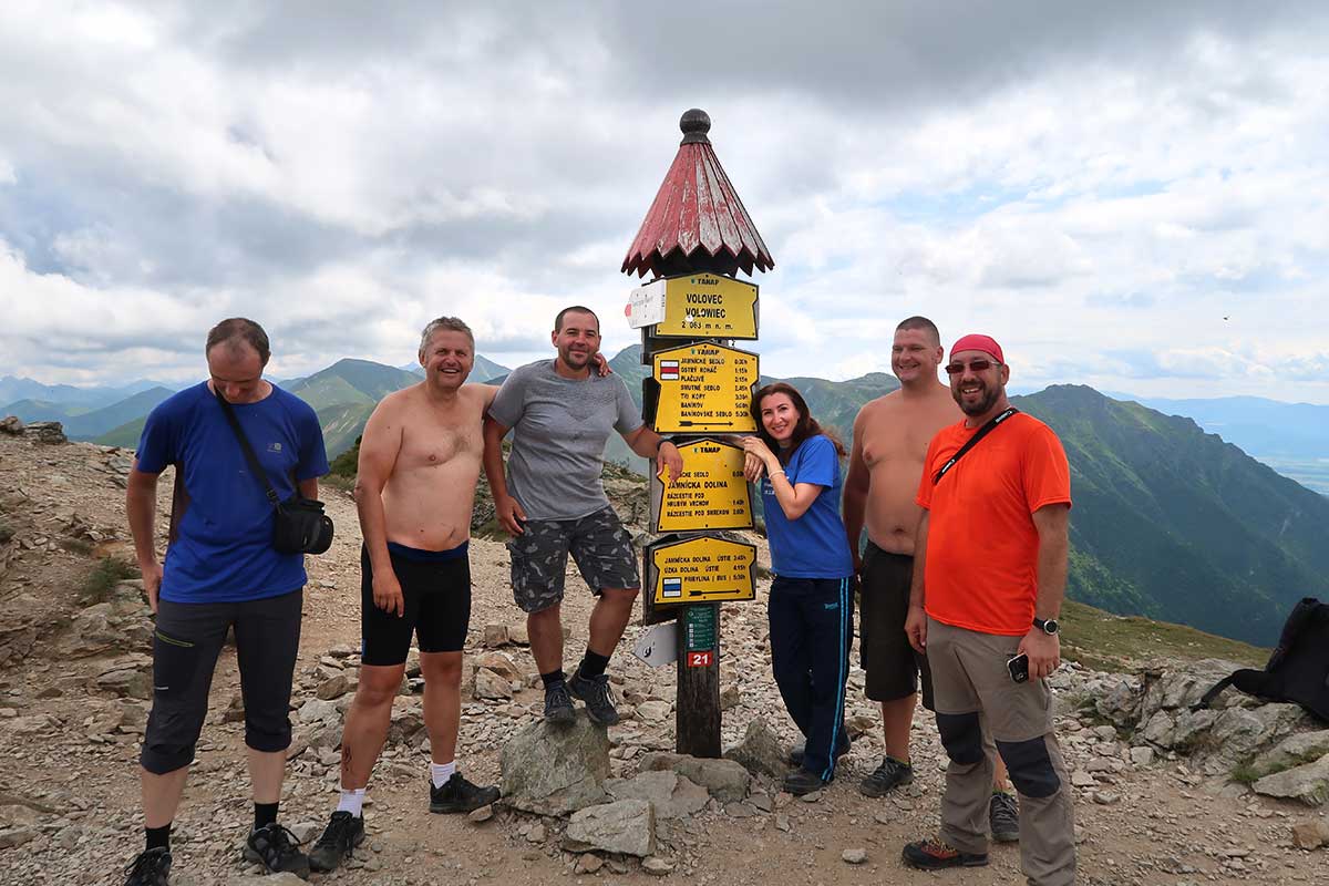 Po ránu zistíte, že nohy dostali po včerajšku parádne zabrať. Túry na Roháčoch sú po skalách. A riadne veľkých. Plní elánu vyrážame na vrchol Volovca. Od chaty vedie strmý chodník priamo do neba, na vrchol hrebeňa. Cestou naspäť kolená zaplačú. Na necelých 2 km nastúpate v serpentínach 350 m. Poviete si. „Hurá som, hore.“ Ale kdeže. To ste len v prvom sedielku Zábrať. Trochu vydýchame, pofotíme a pokračujeme nahor. Po štvrťhodine zdolávame vrchol. „Konečne Volovec.“ Čoby Volovec, to je len ďalší medzistupeň Rákoň. A tá kolmá čiara hore, to už bude Volovec. Paličky pomáhajú a čosi po desiatej stojíme na prvom vrchole dnešného dňa.