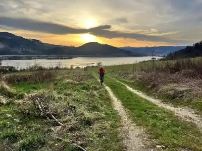 Vyrážame teda niečo po štvrtej niekde od Vodného diela. Popri Váhu to ide rýchlo až do Budatína. Tu musíme kúsoček po ceste, ale objavila som peknú „skratku“ okolo záhradiek a ponad tunel cez lúky. A tu akurát máme krásny výhľad na zapadajúce slnko, Hričovskú priehradu a aj diaľnicu. Pokračujeme ďalej, do Divinky je to už len kúsok.