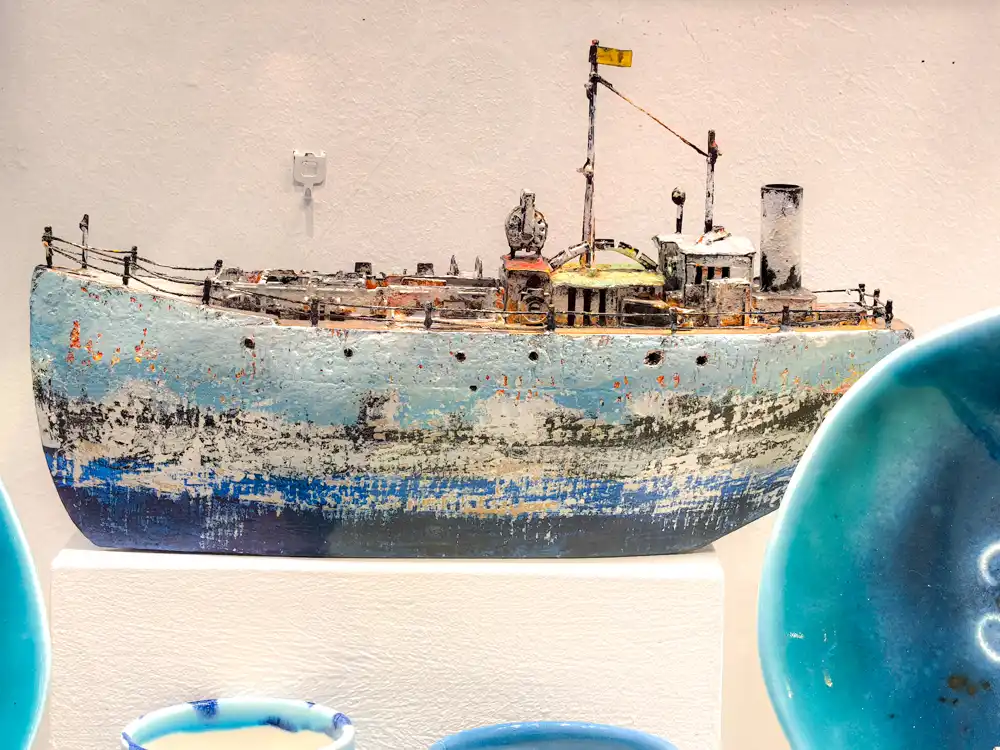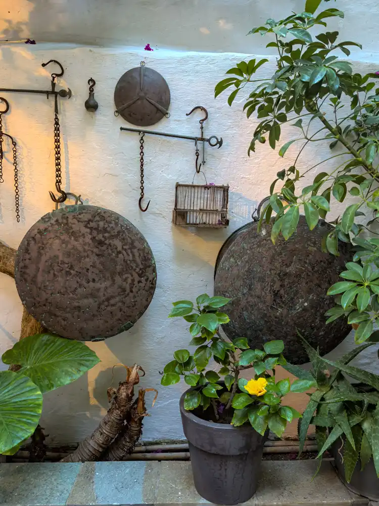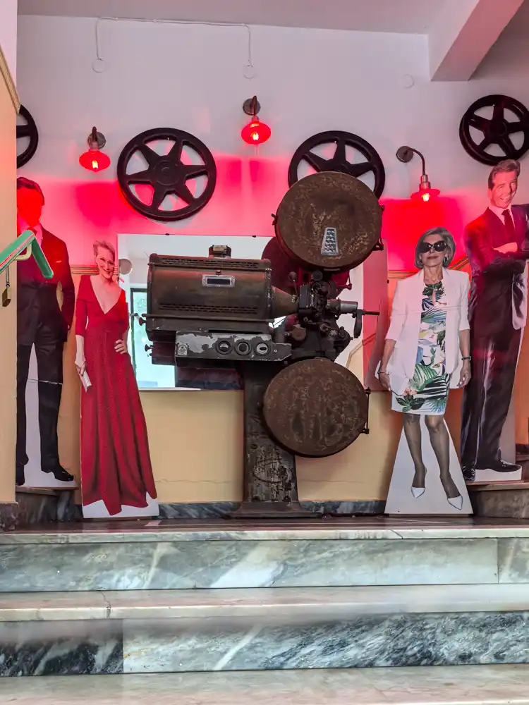 Hneď v druhej línii uličiek vás čaká klasická kombinácia magnetiek, čínskych šortiek a „zaručene“ kožených kabeliek. Je to umný mix suvenírového biznisu a vizuálneho smogu, ktorý drží pokope len vďaka modrej farbe a bielym fasádam. Tie biele steny sú vlastne fascinujúci koncept – každú jar nimi ostrovania prekryjú nánosy plesne po zime, aby vytvorili ilúziu dokonalého stredomoria. Gýčovo milé, ale funkčné. Nájdeš tu módny tovar z Aliexpressu aj netušené skvosty. A všade sú mačky. Skutočným symbolom je tu však jedna filmová obsesia.