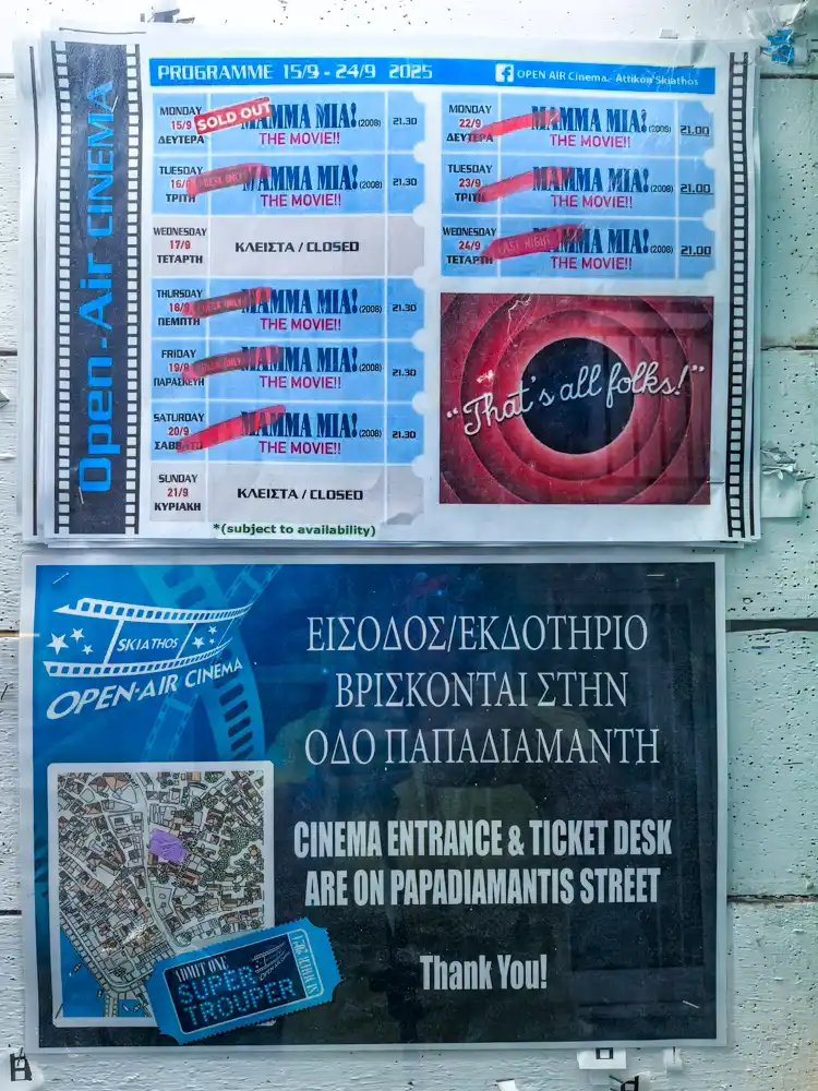 Skiathos je ostrov zaseknutý v čase. Prechádzate po aleji Mamma Mia, k reštaurácii Mamma Mia, a o pár metrov ďalej nájdete kino. Program? Pondelok až sobota: Mamma Mia. Od roku 2008 tu domáci žijú v kinematografickej slučke. Chcete si požičať motorku? Aj tá je „Mamma Mia“.