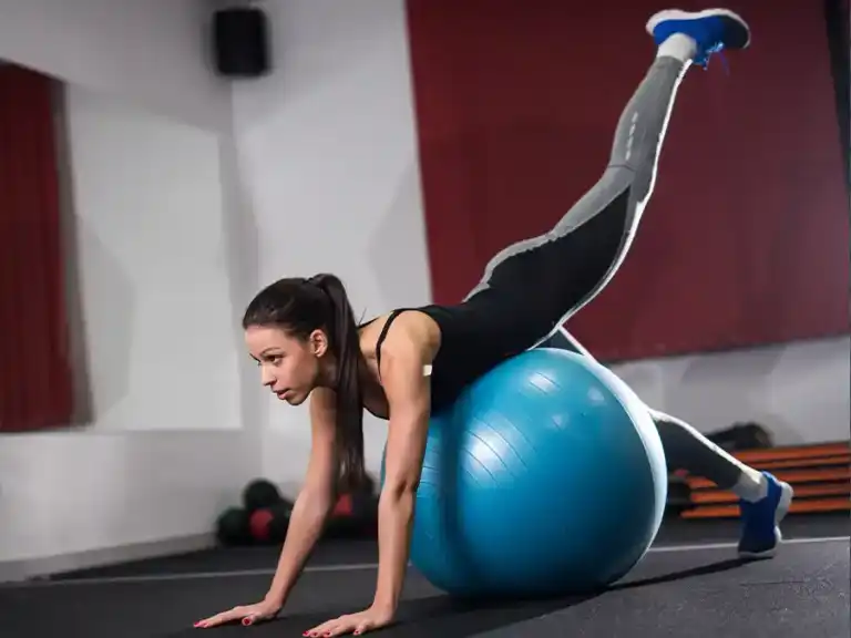 Predlaktia na zemi, nohy na lopte, telo v jednej línii. Brucho drž aktívne, zadok neutrálny. Vydrž 20–40 sekúnd. Kontroluj dych a vyhni sa prehnutému krížu