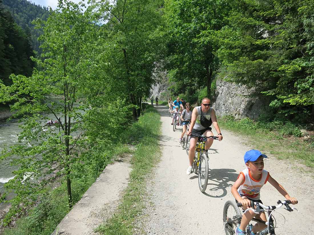 Priamo cez srdce Pienin vedie 8km dlhý cyklo peší chodník popri Dunajci. Nie sme tu prvý ani posledný krát. Ak však chcete v pohode absolvovať cestu bicyklom tam a naspäť, choďte tam buď skoro ráno, alebo mimo sezónu. V exponovaných časoch je chodník plný turistov a budete mať problém sa cez nich preštrikovať.