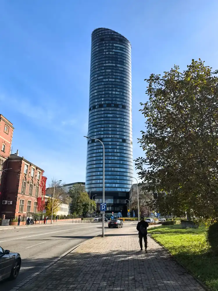 Na kolobežky sme nastúpili skoro ráno. Vroclav sa ešte len prebúdzala. Obrovský okruh nás viedol okolo OC Wroclavia, k ikonickej Vodárenskej veži.