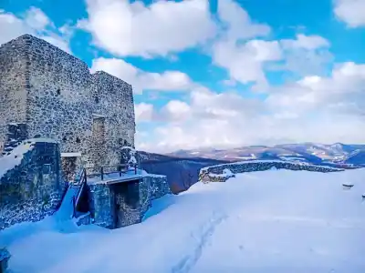 Hneď som sa zastavila pri soche Ondreja III. a kochala sa výhľadmi. Od Kremnických vrchoch, Veľkej Fatry, Nízkych Tatier cez Ľubietovský Vepor po Poľanu. Po mojej pravici by sa mala nachádzať cisterna v Dončovom hrade, ktorá bola ukrytá pod snehom a tak sa brodíme v snehu opačnou stranou k ďalším zachovaným častiam hradu.
