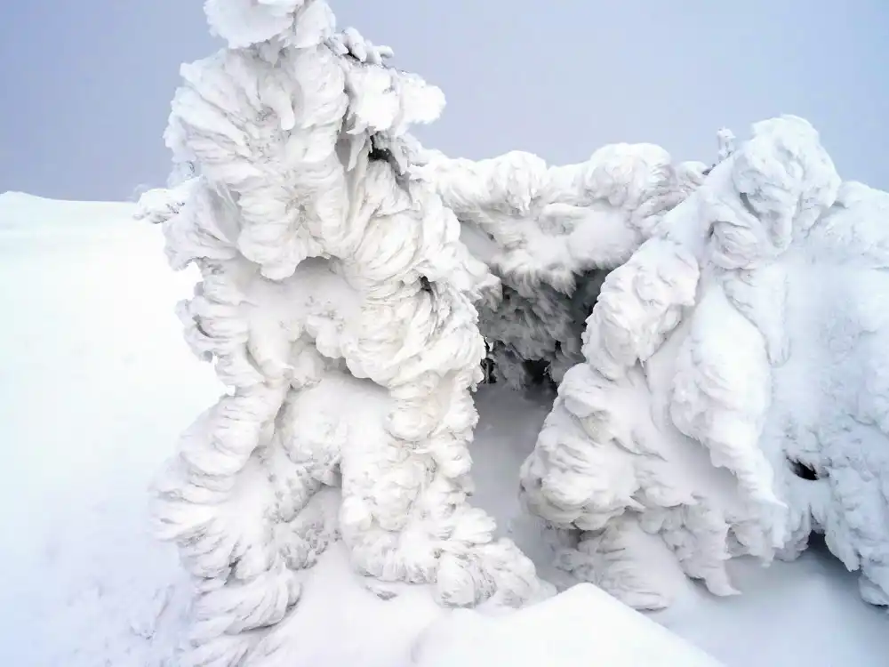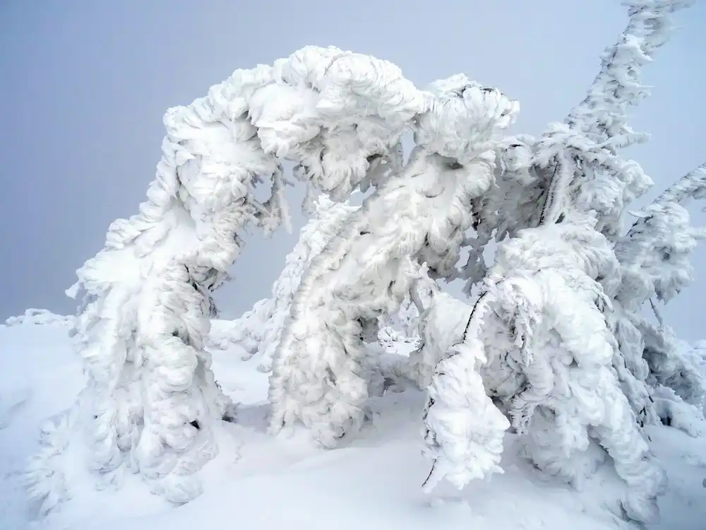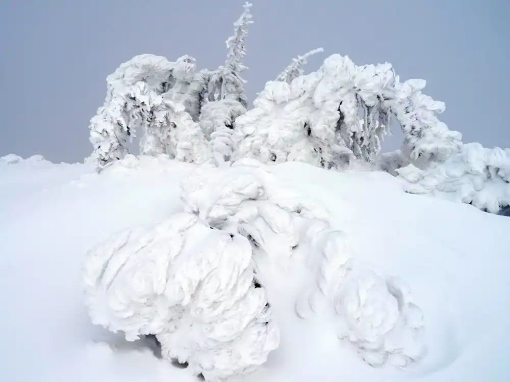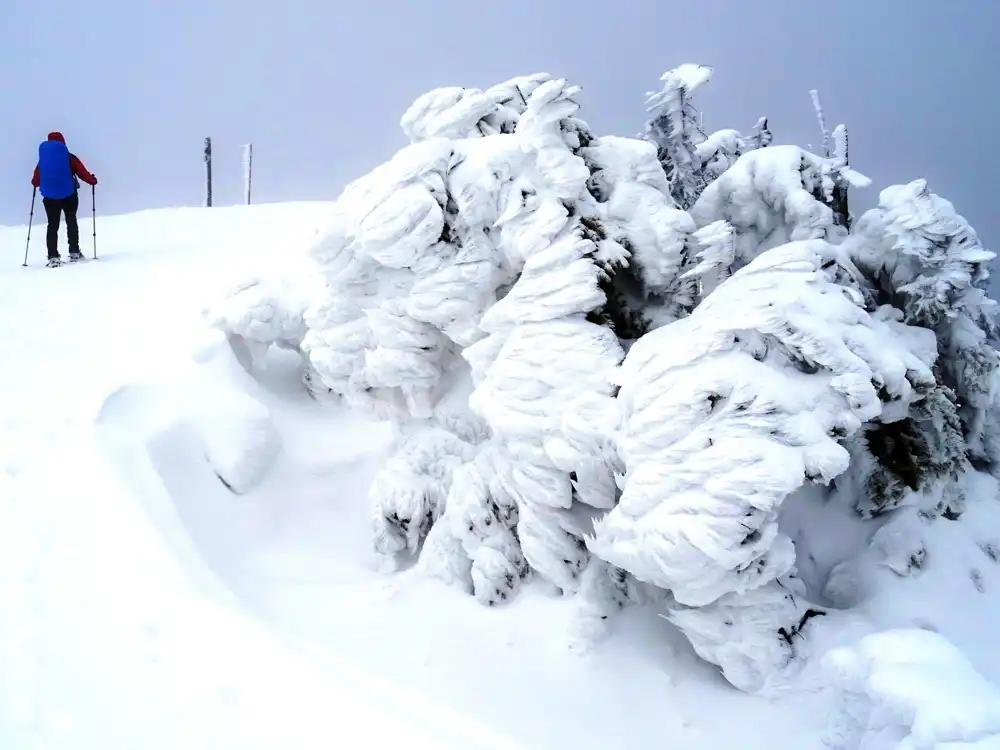 Napojíme sa na značku a krajina sa rozplynie do bielej. Stromy obalené snehom vytvárajú bizarné tvary. „Pozri, ten vyzerá ako medveď,“ ozve sa. O pár metrov ďalej zas nájdeme postavu so sklopenou hlavou. Hmla berie horizont, ale necháva fantáziu.
