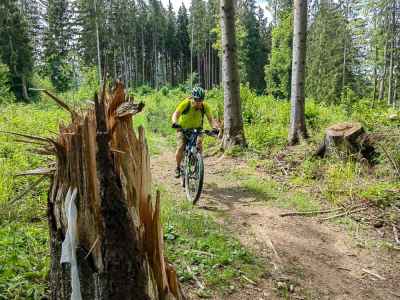 Dole sucho a tu na hrebeni obrovské blatové mláky. Pri prejazde a niekoľkých čľupnutiach do mlák som si spomenul na slová pána Kravčíka, že vodu treba zadržovať v lese. Na tomto úseku sa to Oravským lesákom podarilo. Najmä vďaka konárom, haluzine a štiepke, ktoré pri zlom prejazde hrozila utrhnutím prehadzovačky.