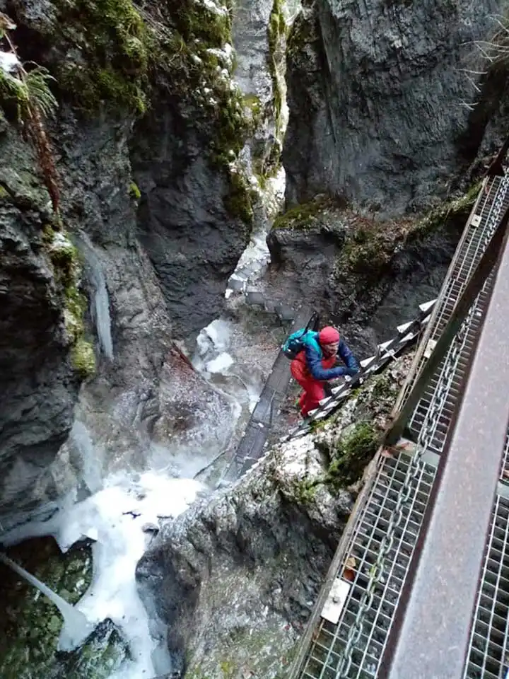 Stúpame roklinou, miestami prechádzame po pieskových nánosoch, po drevených vodorovných rebríkoch, kovových stúpačkách a rebríkoch.