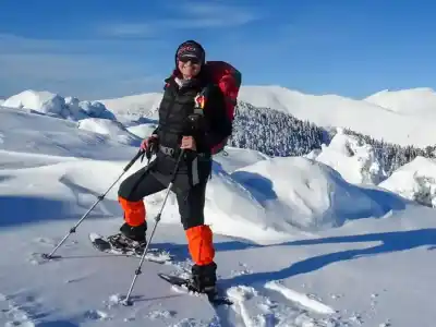 Začiatok trasy je „najvýživnejší“. Hneď na rozohriatie zdolávame výstup po ľavej strane zjazdovky. Vidíme, že bez snežníc to nepôjde, tak si ich bez rozmýšľania dávame na nohy, aj tak by sme sa tomu neskôr nevyhli.